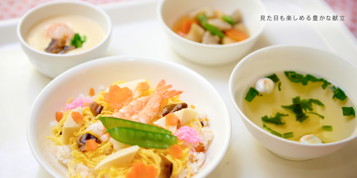 京料理花萬では、子どもたちの成長と健康を考えた栄養バランスのとれたメニューと安全な調理はもちろん、趣向をこらした京料理や日本食を取り入れた献立を提供しています。