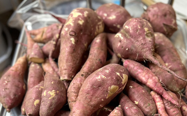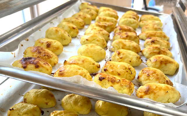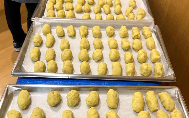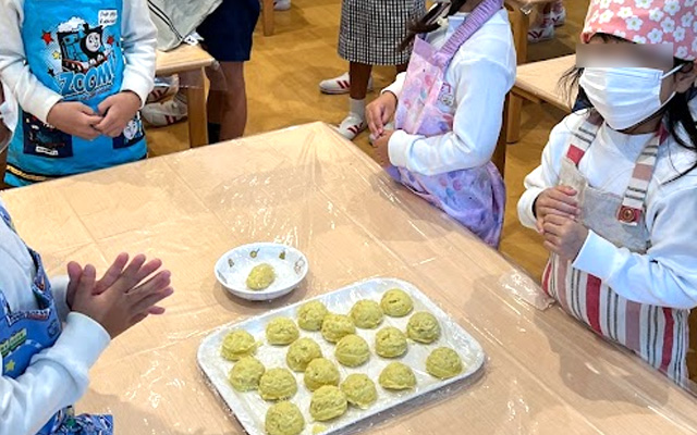 園児たちが芋ほりで収穫したサツマイモを使用し、自分たちでスイートポテトの成型をしました。